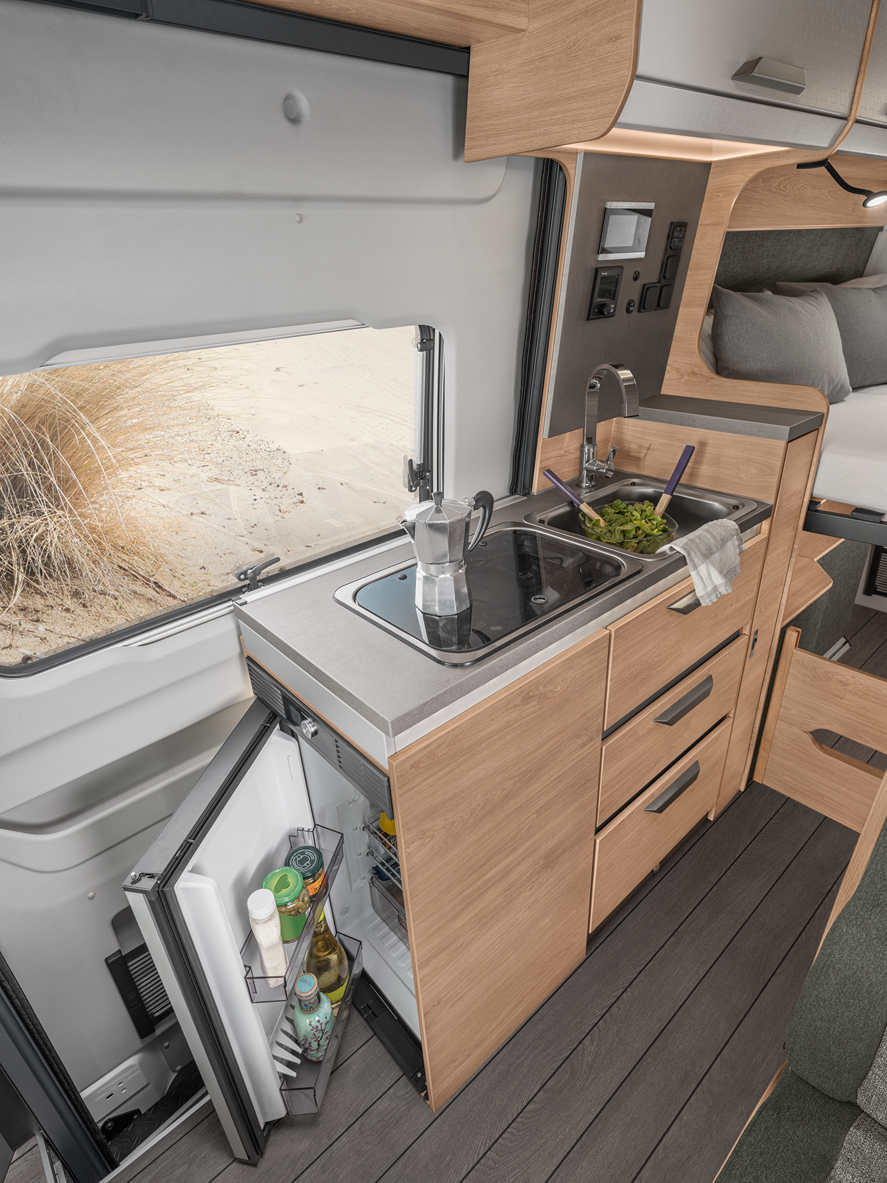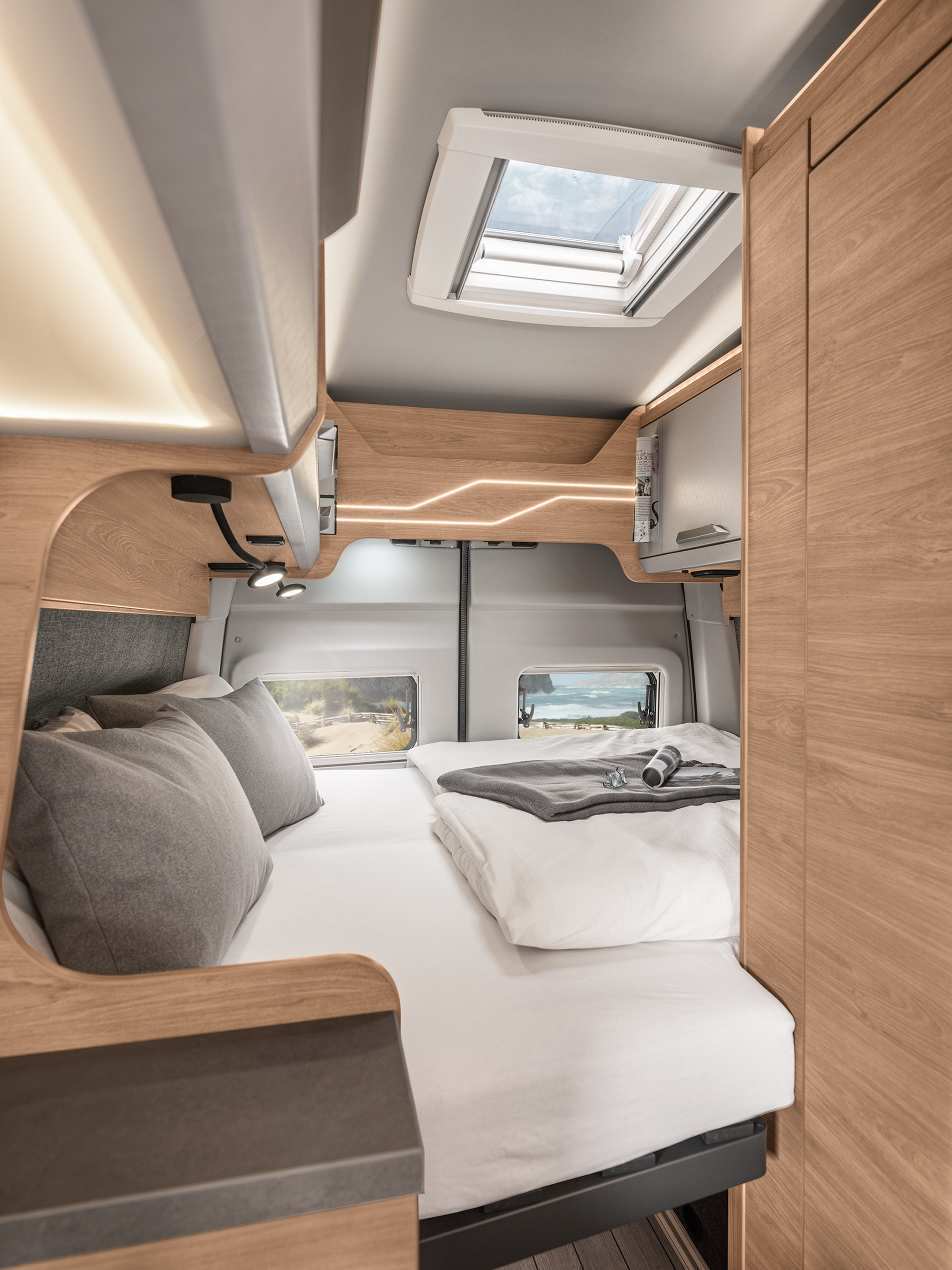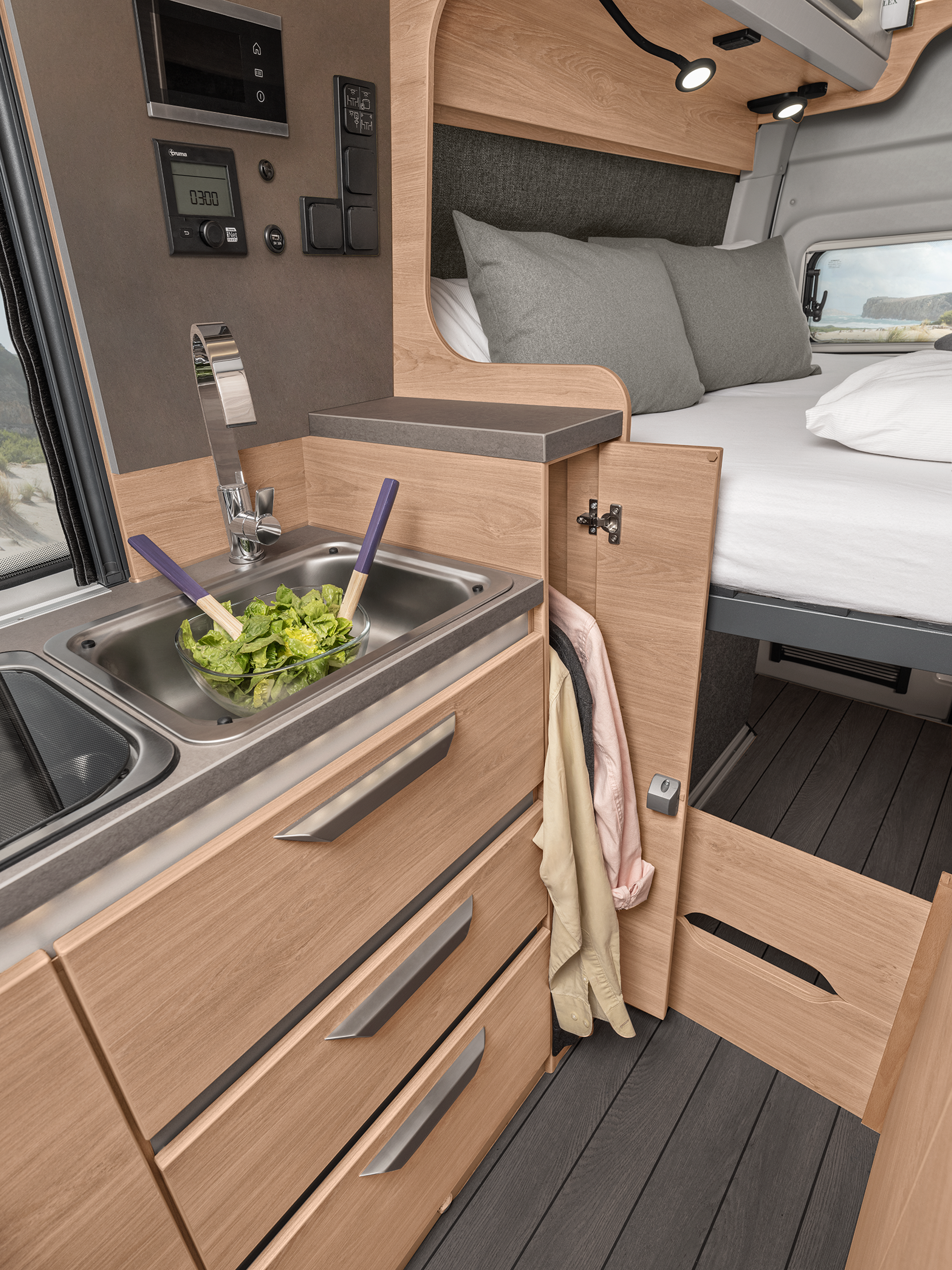 Der Knaus Boxdrive 600 XL ist ein hochwertiger Kastenwagen, der sich durch Funktionalität und Komfort auszeichnet. Mit einer Länge von rund 6 Metern bietet er ausreichend Platz für Reisen, ohne an Wendigkeit zu verlieren. Dank des XL-Aufbaus verfügt der Camper über eine erhöhte Stehhöhe und ein großzügiges Raumgefühl. Das moderne Interieur kombiniert praktische Lösungen mit hochwertigen Materialien, darunter eine voll ausgestattete Küche, ein komfortables Schlafbereich und ein gut durchdachtes Badezimmer.