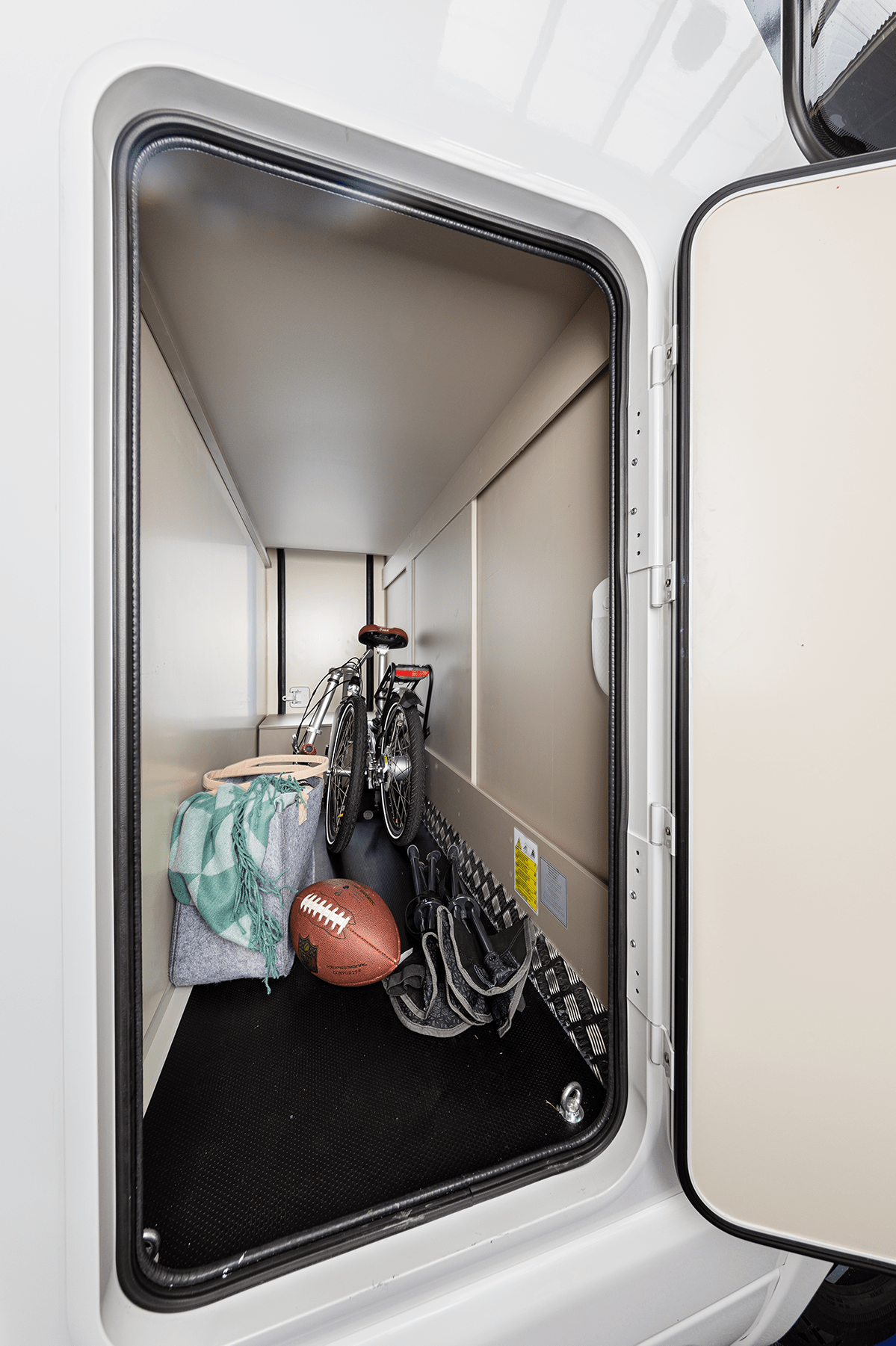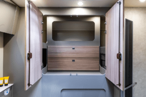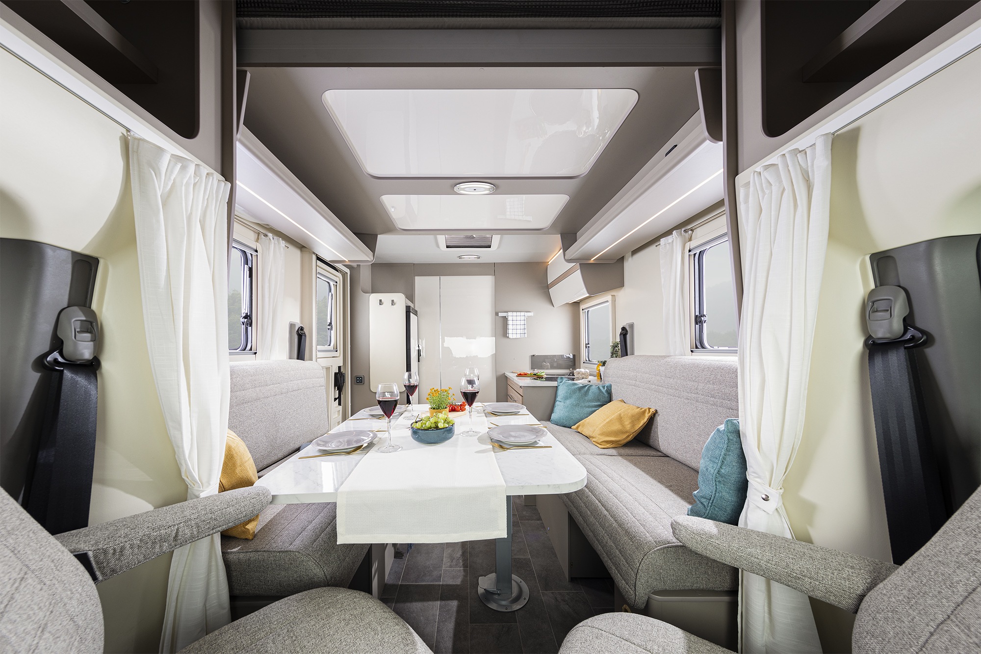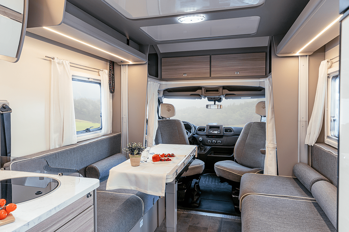 Dank einem flexiblen Hubbett und drehbaren Fahrersitzen eröffnet sich im ACT 640 ein großzügiger Wohnraum. Der flexible Schlafbereich für bis zu vier Personen, der nicht wie üblich statisch den Heckbereich einnimmt, ermöglicht ein großzügiges Bad mit genügend Platz für eine Trennung zwischen Dusche und WC Dadurch entsteht auch Platz für einen großen Schrank, der für Kleidung und sonstige Utensilien ausreichend Stauraum bietet. Durch die optimale Raumaufteilung entfällt beim ACT 640 die Entscheidung zwischen wendigem Fahrzeug und großzügigem Raumgefühl.